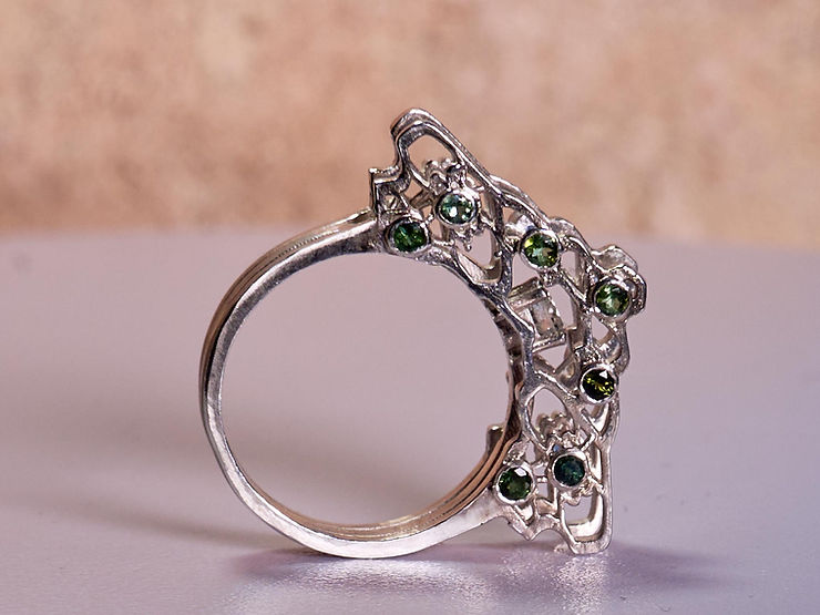 Todo comienza con una imagen o una emoción. La transformo en un boceto y paso al banco de joyería. Trabajo con plata 925 reciclada, oro y piedras preciosas, utilizando técnicas tradicionales como: